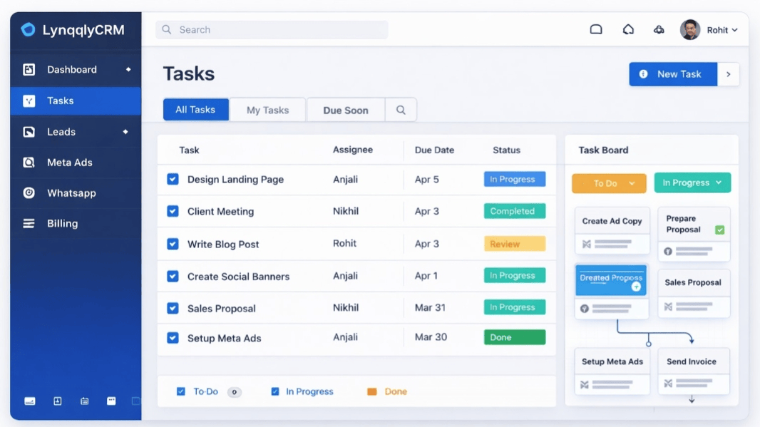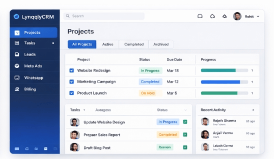 LynqlyCRM brings projects, tasks, Meta Ads, WhatsApp automation, CRM and billing into a single powerful SaaS platform.